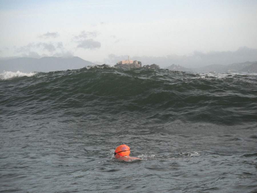 Intrepid pilot Dave Zovickian had the guts to capture the wake that that nasty containership threw at us during the Baybridge swim on sunday. “Here’s what I was able to get before I panicked….” was his comment. You can see the container ship pass by and then the wake building. Great photojournalism. Thanks Dave!